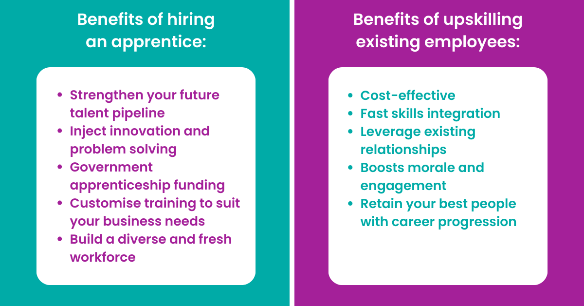 With employers in England spending an average of £6000+ per new hire and facing a growing digital skills shortage, the smarter question isn't if they should invest in workforce development, but how to do it cost-effectively. Should you hire a new apprentice to inject energy and innovation into your business? Or is it more effective to upskill your current employees by enrolling them in an apprenticeship programme?